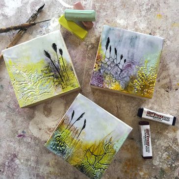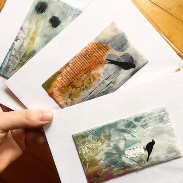 Little original encaustic paintings mounted on 5x7 backing made from 100% recycled fibre.